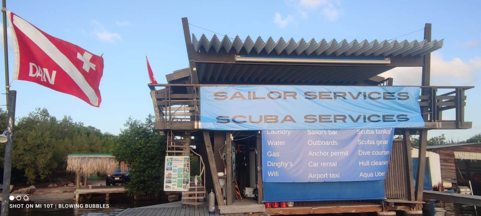 The center provides various services such as WiFi, laundry, water delivery, car rental, airport rides, propane, BBQ area, scuba tank fillings, outboard rentals, sightseeing, and scuba diving tours.