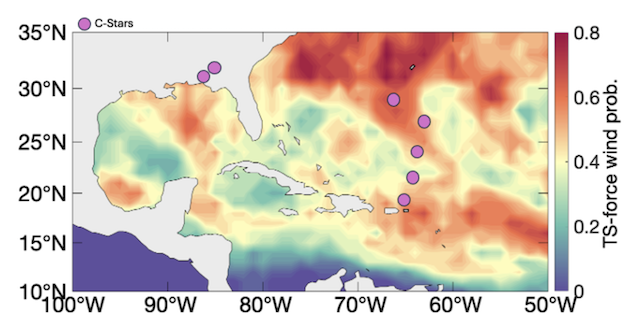 Wind-propelled with solar-powered sensors, C-Stars transmit real-time data on wind speed and direction, sea surface temperature, air temperature, air pressure and relative humidity via satellite for forecasters and scientists. C-Stars are also equipped with electric motor thrusters to improve positioning to intercept a hurricane or when winds are weak. Wave condition data, high-resolution images and movies will be available once the C-Stars are recovered.