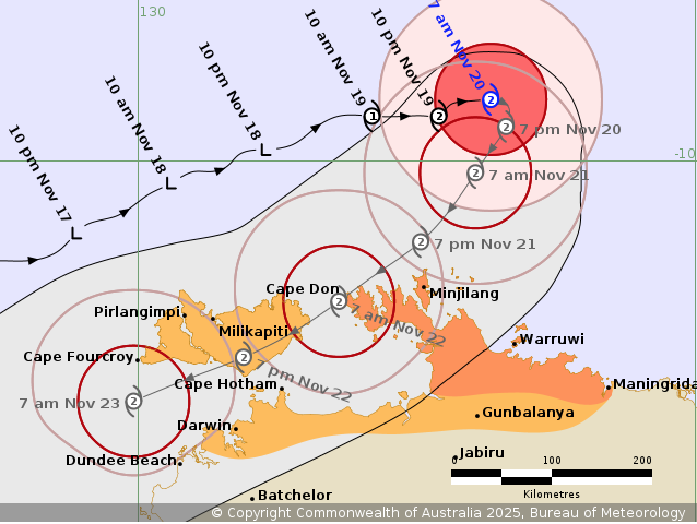 Hazards include gales with damaging wind gusts to 120km/h and with destruction wind gusts up to 155km/h as the system nears the coast with the Tiwi Islands and possibly Darwin likely to be affected on Saturday November 22.