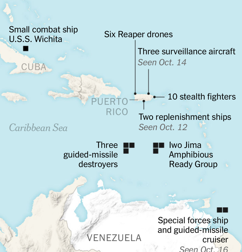Relations between the United States and Venezuela have deteriorated sharply, as the US steps up counter-narcotics operations, destroying several suspected Venezuelan drug-trafficking vessels and expanding its military presence in the region. It is the largest deployment of U.S. forces in the region in decades with about 10,000 troops at sea and on shore.
