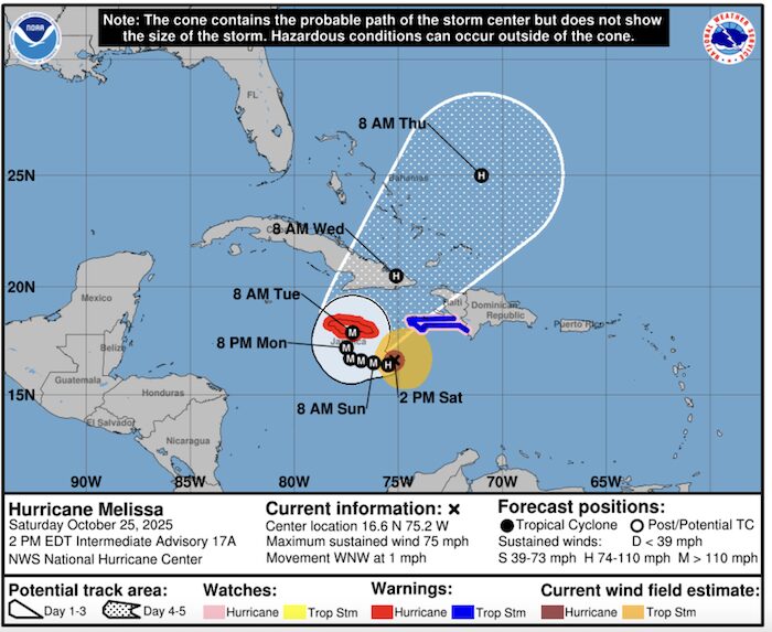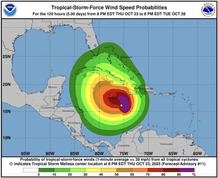 The NHC warned coastal flooding was likely along the coast of Jamaica by Saturday in areas of onshore winds as tropical storm conditions begin to reach the area. “However, there is a potential risk of a more significant storm surge, especially along the south coast of Jamaica, early next week. Due to Melissa’s slow motion and large forecast uncertainty, it is still too soon to know exactly how high the storm surge could reach.”