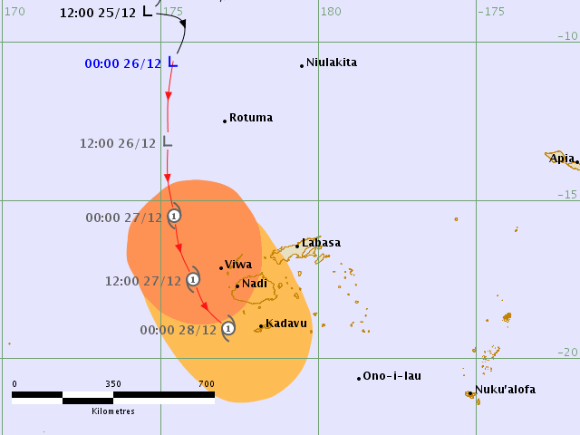 - Forecast track of the tropical depression to the west of the Fiji Island chain at December 26, 2019 (c) Fiji Met Service.