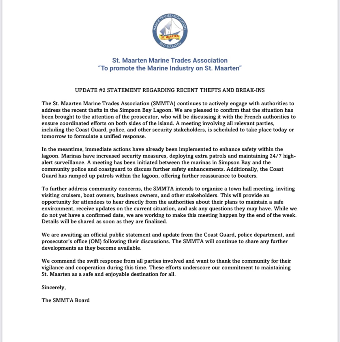 According to the latest statement from SMMTA, the organisation says they are actively working with authorities to address the recent thefts in Simpson Bay Lagoon. Patrols have increased and a unified response is being developed. A town hall meeting is planned for cruisers and stakeholders to share concerns and hear updates.
