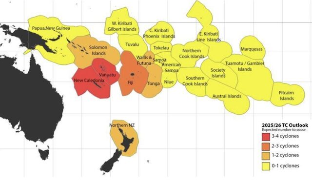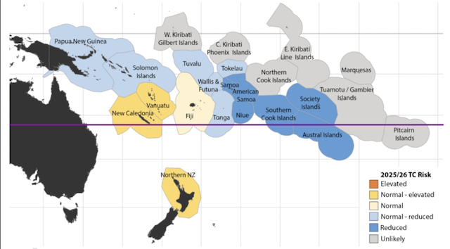 Forecasters in the South Pacific are expecting normal to below normal activity in most areas for the 2025/2026 tropical cyclone season but say the risk of Tropical Cyclone impact could be higher near the Coral Sea, and around New Caledonia and Vanuatu.