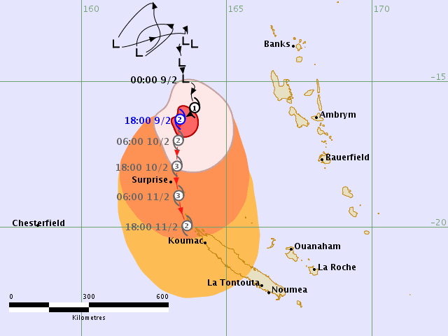 Vanuatu, which lies north east of New Caledonia, had been experiencing heavy rain and strong winds from a tropical low which has now developed and intensified into a Category Two Cyclone Uesi.