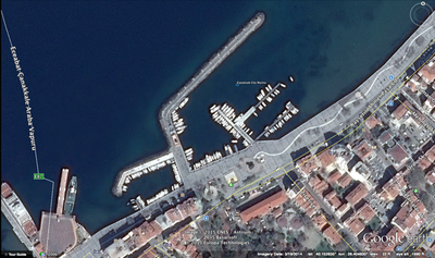 This google earth image shows the commercial ferry dock on the left, with a small harbor adjacent which is for fishermen (who also tend to use the larger harbor as well).