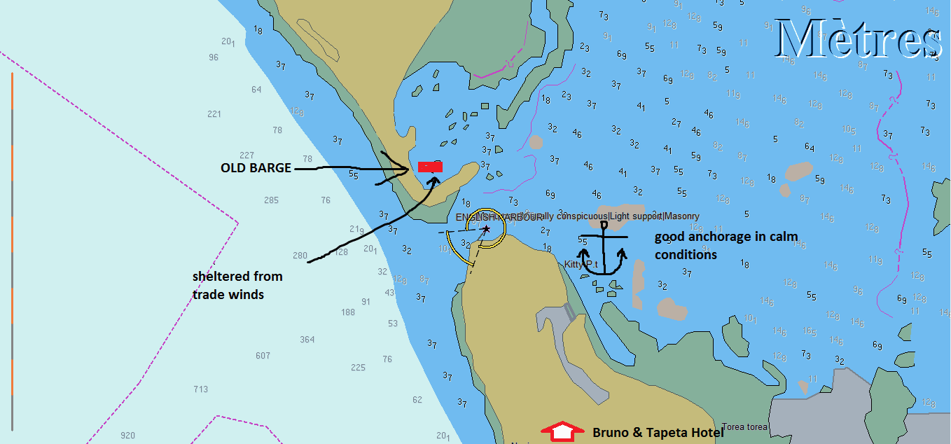 Bruno will be happy to give some anchor tips, help fixing things or just chatting. He advised us to anchor in the north side of the pass when the wind became stronger and it worked very well (see photo). There is an old barge beached and you can tie the boat to it. At low tide, we have a clearance of 2.2 meters. It is comfortable, well protected and Bruno can explain how to reach there.