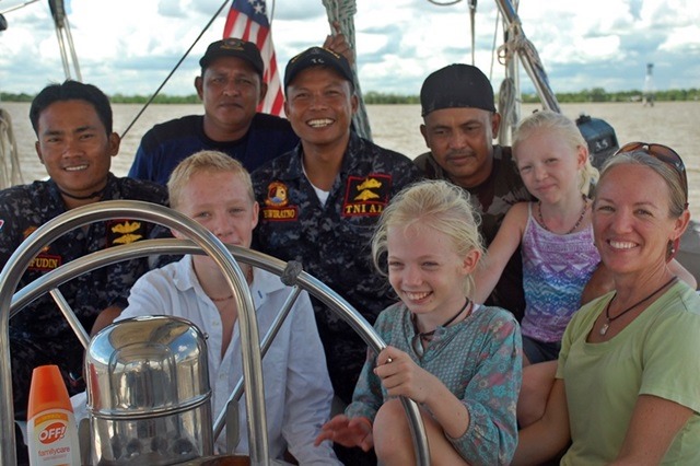 Later that morning, Budi and his crew ferried out that pesky official. We completed formalities quickly enough and gave him a requested tour of the boat. Happy to share, of course. It was over soon, and time for him to go. He sat in the cockpit and squirmed, clearly uncomfortable about broaching the subject in front of an audience but wanting desperately to ask for a bribe again. This discussion was all in Indonesian, through me as the interpreter to our family. I practically hid behind my Navy friends, I confess: but Budi pressed the point. “Aren’t we done here? It’s time to go.” He physically and verbally distanced himself and was as eager to shuffle the corrupt official off Totem as I was. We were was soon successful.