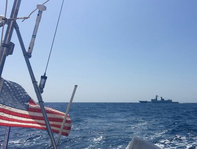 Stayed about 2nm south of the corridor. Glad we transmitted AIS and ran with lower running lights. Nearly hourly VHF ch16 broadcasts from coalition warships making their presence & services known. Daily, sometimes twice, naval aircraft flybys with direct radio contact made with each vessel.
