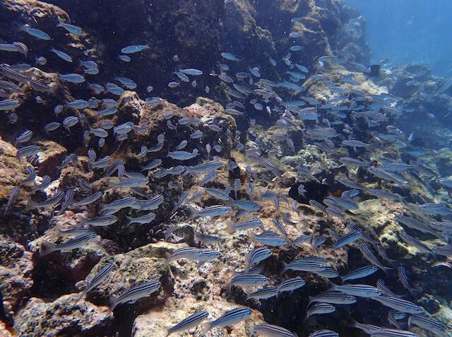All the snorkelling we did was over a rocky seabed, or sand; no coral reefs! But there are plenty of large fish, large schools of fish, and green turtles and you might also be underwater with sharks, rays, iguana, octopus, sea lions, penguins, and even sea horses depending on the site.