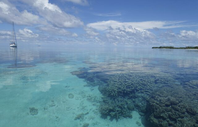 We anchored on the SE side in the shelter of a large reef and it was calm in N winds and in a light easterly breeze. We had quite a few canoes coming by with adults wanting to trade produce and giggling children who spoke surprisingly little English. The water’s super clear with a strong current, nevertheless the reef was a disappointment with mostly dead coral.