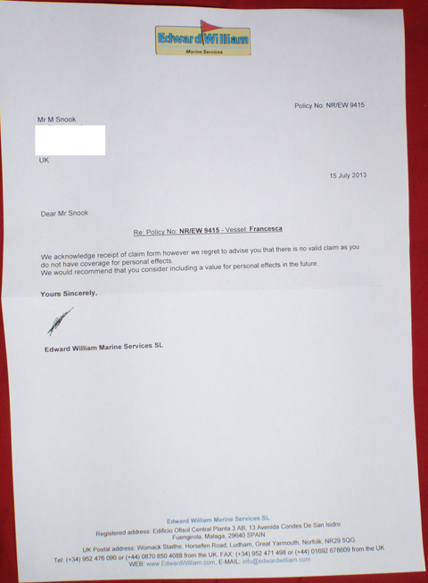 My boat Francesca was comprehensively burgled in Gallions Point Marina in London in July of this year. Despite advising the insurance company exactly what contents cover I needed BEFORE renewing, they’ve rejected the entire claim out of hand, in fact, the whole letter is only two sentences long (see a photo of letter adjacent)!