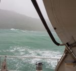All the vessels that had anchored close to the reef were now within striking distance of the rocks and because they were in such shallow water, where the huge waves were breaking, they bounced violently, both side to side and forward to aft. One by one the captains of these vessels realized they had to run from the lee shore out into the storm or to find themselves on the reef. At least two vessels dragged their anchors, sliding perilously close to rocky reefs before they made the decision to abandon the anchorage. A third dragged past an unused mooring buoy, fouling his anchor chain on the buoy’s mooring chain and several people on that boat huddled at the bow for half an hour in outrageously dangerous conditions debating how to untangle from the mooring. We watched with binoculars – the storm was powerful, even though it had not reached its height yet – and saw not a single person on any other boat wearing a life vest or tether, but many running around on deck unsure what to do. We could feel their panic. Remember, most of these people are not experienced, sailors. They’re nice German couples and South African families who’ve flown here for a one week sailing holiday on a crewed sailing cat. Most of the captains are locals, and we don’t know how much sailing experience they have, but we do know from our own observations that they do not all anchor as cautiously and conservatively as we do.