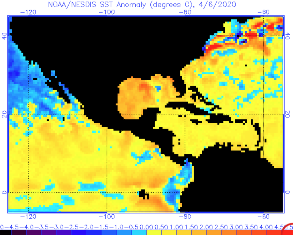 Sea Surface Temperatures: A troubling sign for the entire season is Sea Surface Temperatures (SSTs), which are running at least 1 degree C warmer than normal throughout the Caribbean, as well as Tropical Atlantic E of the Caribbean (which is commonly referred to as the “Main Development Region”, or MDR). Worse, SSTs in GulfOfMexico are 1 to 4 degrees C above normal, which is a tremendous anomaly. (see images)