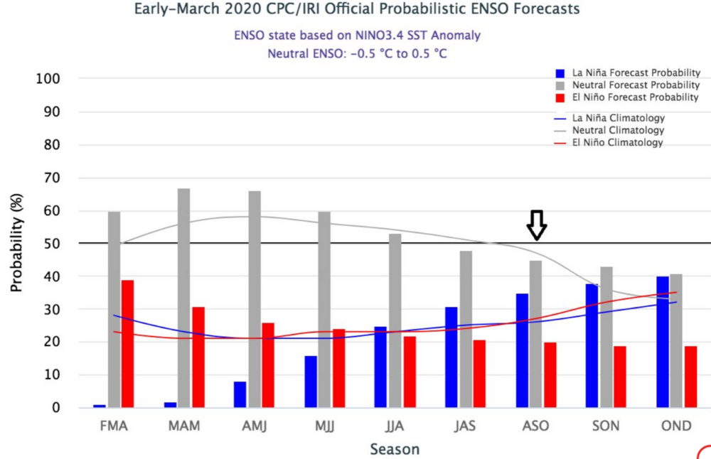 The El Nino / La Nina cycle is presently neutral, but forecasts (see image, credit: @philklotzbach) suggest a weak La Nina may form during our summer (by August), and this could support more Tropical activity than normal in mid and late parts (August-December) of the Atlantic Hurricane season.